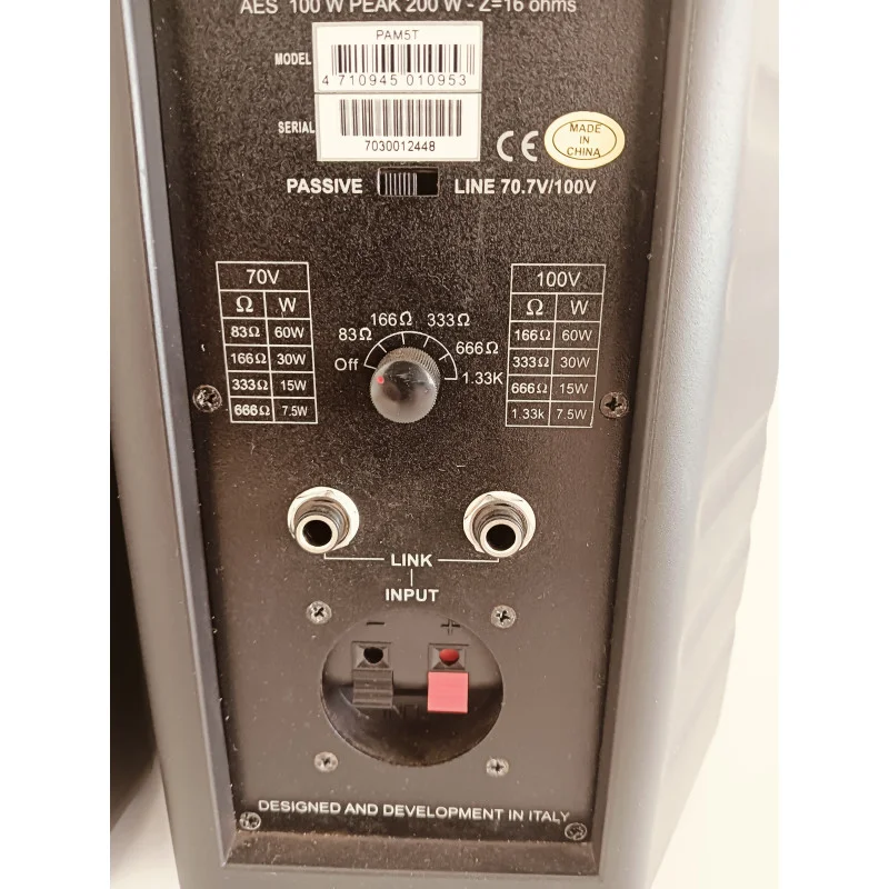 Colunas Passivas ou de linha.B-stock. Sem embalagem original. VENDIDAS AO PAR Modos de entrada passiva ou de tensão de linha (comutável através do painel traseiro)Pode ser usado com linhas de 70 ou 100 VoltsFornecido com tomada Jack de 1/4 de polegada, bem como tomada do tipo push-pullO segundo conetor pode ser utilizado como um LINK para ligar mais armários PAM em sériePodem ser utilizados amplificadores até 100 watts em modo passivo5 valores de impedância selecionáveis pelo utilizador INFORMAÇÃO TÉCNICAPAM5-T MONITOR DE TENSÃO CONSTANTE 70,7V/ 100VCONFIGURAÇÕES PASSIVAS Manuseamento de potência: 100 W padrão AES / 200 W de potência de picoResposta de frequência: 75Hz - 16kHz @ +/- 10dBSensibilidade ( 1watt @ 1mt ): 94dB (banda de oitava de 1-2kHz)SPL máximo (@1mt): a 100W 114dB; a 200W 117dBComplemento do altifalante: Dois altifalantes de 5 polegadas de alcance alargado.Conectores: INPUT - LINK em Jack Mono para aplicação ao vivo, ou terminais de pressão para Tensão Constante em instalação fixa.Seletor deslizante para Passivo ( Low Imp ) / 70.7V / 100V ( High Imp )Interruptor rotativo para saída de potência selecionável (6 passos)Impedância: 16 ohms nominal (com seletor em Passivo)CONFIGURAÇÕES DE TENSÃO CONSTANTE DE 70,7 V / 100 V Manuseamento de potência: 60W AES Standard / 120W Peak (limitado por transformador)Resposta de frequência: 75Hz - 16kHz @ +/- 10dBOpção de 70,7V: 60W (83ohm); 30W (166ohm); 15W (333ohm); 7,5W (666ohm); opção OFF 100V: 60W (166ohm); 30W (333ohm); 15W (666ohm); 7.5W (1.33kohm); OFFMateriais da caixa: Plástico de alta resistência, cor antracite.Ponto de fixação: 4xM5 standard (2x Vertical e 2x Horizontal)Dimensões: H31.5 x W19.5 x D19.5 cmPeso: 5kg 11lbs